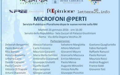 La Fondazione Italia Protagonista insieme alla Fondazione della libertà, Liberamente, Free Foundation, l’Opinione e Lettera 22, organizzano il convegno “MICROFONI @PERTI – Servizio Pubblico e Pluralismo dopo le nuove norme sulla RAI“. Il convegno si terrà doman